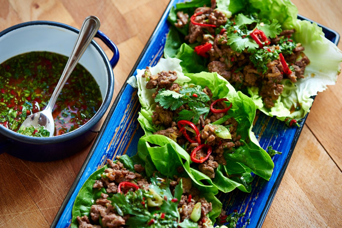 5. Vul de blaadjes sla met het vlees (inmiddels flink afgekoeld). Giet er voorzichtig wat dressing over en eventueel nog wat extra koriander. De dressing is redelijk sterk van smaak: voeg maar een klein beetje toe. Meer kan altijd.
