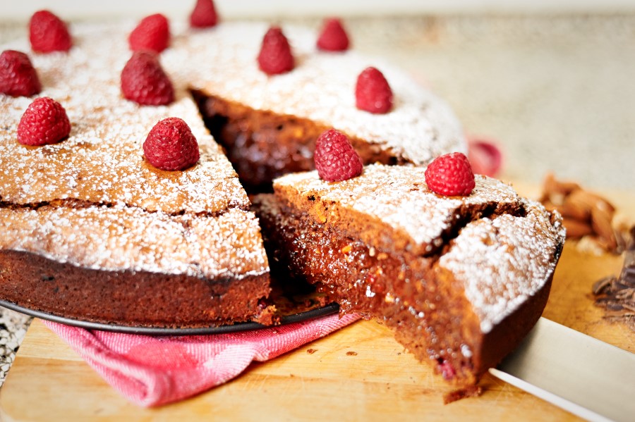 9. Garneer met wat losse frambozen en poedersuiker. Snij in stukken. En geniet.