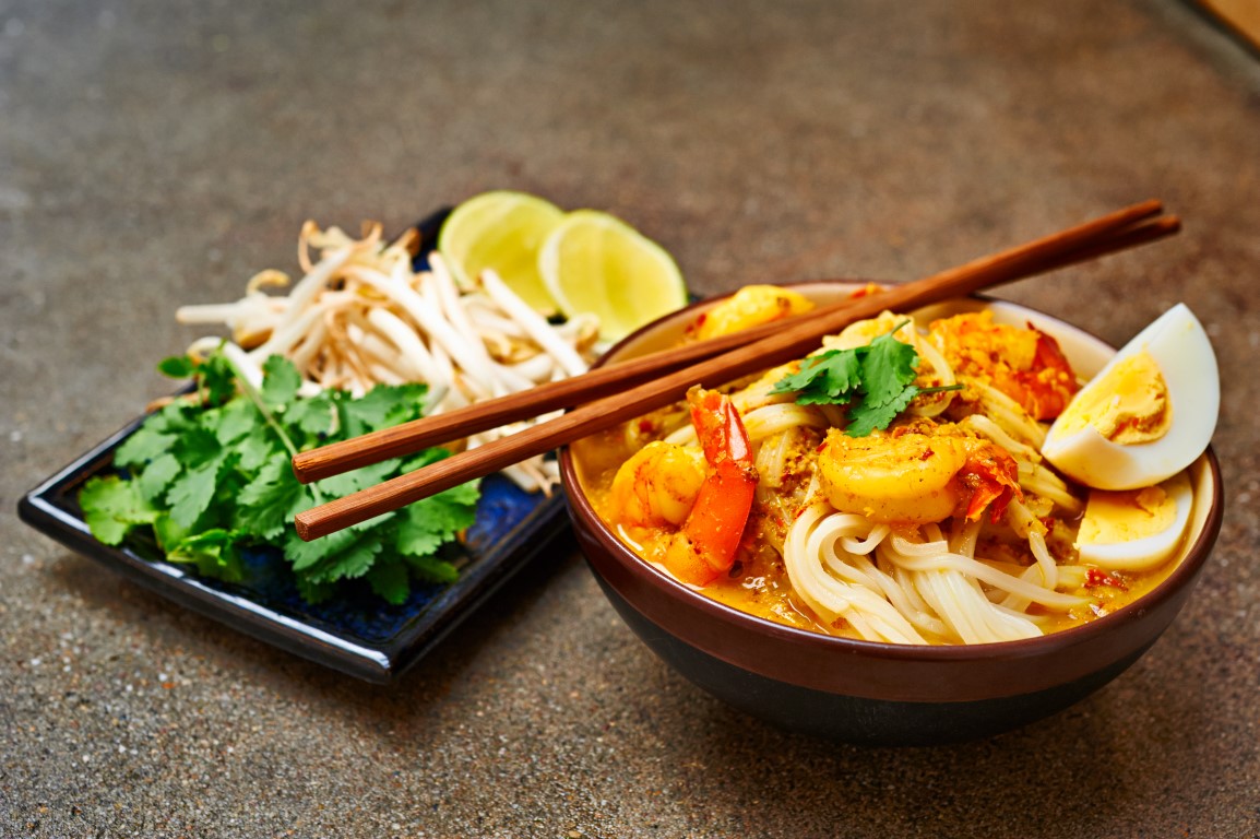 Een razend populaire soep in Maleisië en Singapore: de laksa. Er zijn eigenlijk twee soorten; assam laksa en curry laksa. De assam laksa is een zure, kruidige soep en de curry laksa wordt met kokosmelk bereid. In Singapore zijn er iedere jaar ware laksa-wedstrijden. Waar laksa vandaan komt? Geen idee. Ik lees verschillende verhalen. ‘Lakhshah’ is Hindi voor een soort vermicelli. Het zou ook van het Chinese woord 辣沙 kunnen komen, vertaald: ‘pittig zand’. Dit zou door gemalen, gedroogde garnalen komen die dan op de bodem van de soep zouden liggen. Waar het precies vandaan komt, maakt me niet eigenlijk niet zo veel uit. Ik vind het een geweldige soep en ik maak dit keer de curry laksa, zoals ik die in Singapore heb gegeten.