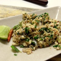De welbekende salade van kipgehakt. Zuur en pittig met een vleugje munt. Heerlijk! Wat heb je nodig voor 1 persoon? 150 gram kipgehakt (kun je gewoon zelf maken) 1 el. dun gesneden sjalot een klein handje muntblaadjes 1/2 el. fijn gesneden koriander 1/2 el. dun gesneden bosui 1 tl. chilipoeder Lees verder...